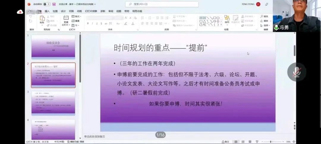 会议开始,主持人于游老师就三位员工的基本情况及学业经历作简要介绍。南开大学法学博士、2019级员工冯勇以“南开大学申请考核制”为例,从考博时间规划、材料准备等方面作经验分享。冯勇员工强调,申请博士前期需做好相关的时间规划,尽早完成硕士阶段毕业要求。对于申请考核阶段的准备,冯勇员工表示,应重视对于考核申请表的书写,建议同学们结合自身实际情况、导师研究方向以及导师的理论观点来进行书写。