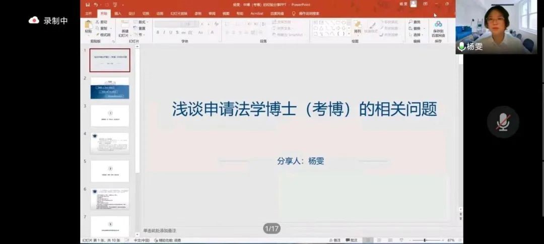 接下来,华东政法大学法学博士、2019级员工杨雯在谈到“博士生”身份时,建议学弟学妹们对博士阶段可能面临的困难有所预期。杨雯员工强调,联系导师是申请博士过程中的重要环节。杨雯员工从信息搜集、整理资料、保持适度联系等三方面具体介绍联系导师的的注意事项。杨雯员工多次谈到外语对学术研究的重要性,并建议同学们在精力充沛的前提下学习第二外语,尝试阅读外文文献,提升自身外语水平。