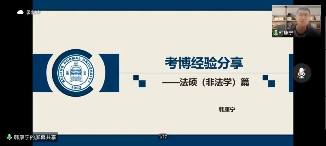 最后,北京师范大学法学博士、2019级员工韩康宁在谈到读博前期准备时,启发同学们要明确自身需求,避免盲目考博。韩康宁员工表示,“热爱是一切的前提”,对于学术的真挚热爱是决定进行下一步深造的重要原因。韩康宁员工以某双一流大学2019年和2020年法律(非法学)专业的读博情况,谈及法律(非法学)专业员工读博的优劣势,向同学们介绍了考核制和普通招考的区别。韩康宁员工对有志于未来进一步深造的同学提出两点建议:在前期准备阶段,要确定自己的研究方向,打好法学理论基础,培养自己的学术科研能力,利用多种渠道发表学术论文,积累自己的科研成果;在后期考核阶段,要保持良好的心态,找到感兴趣的学术研究方向,劳逸结合才能高效备考。