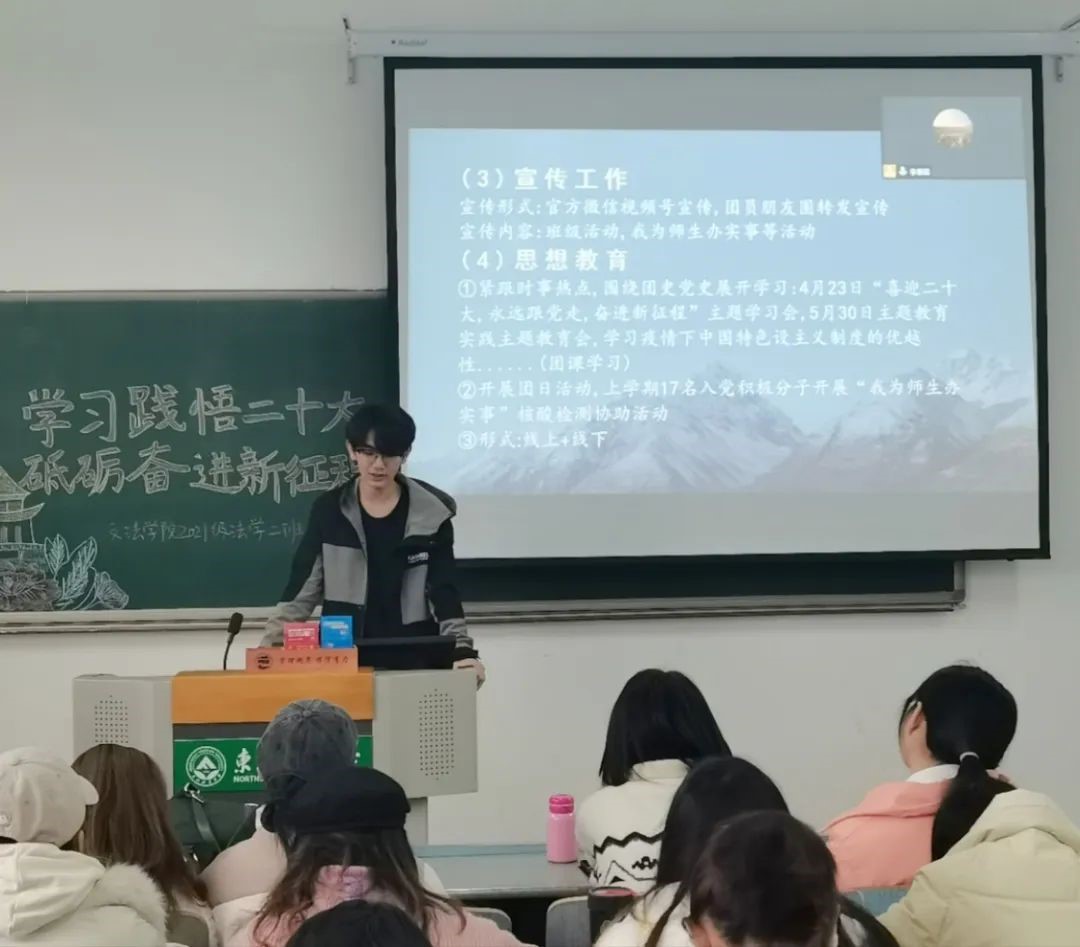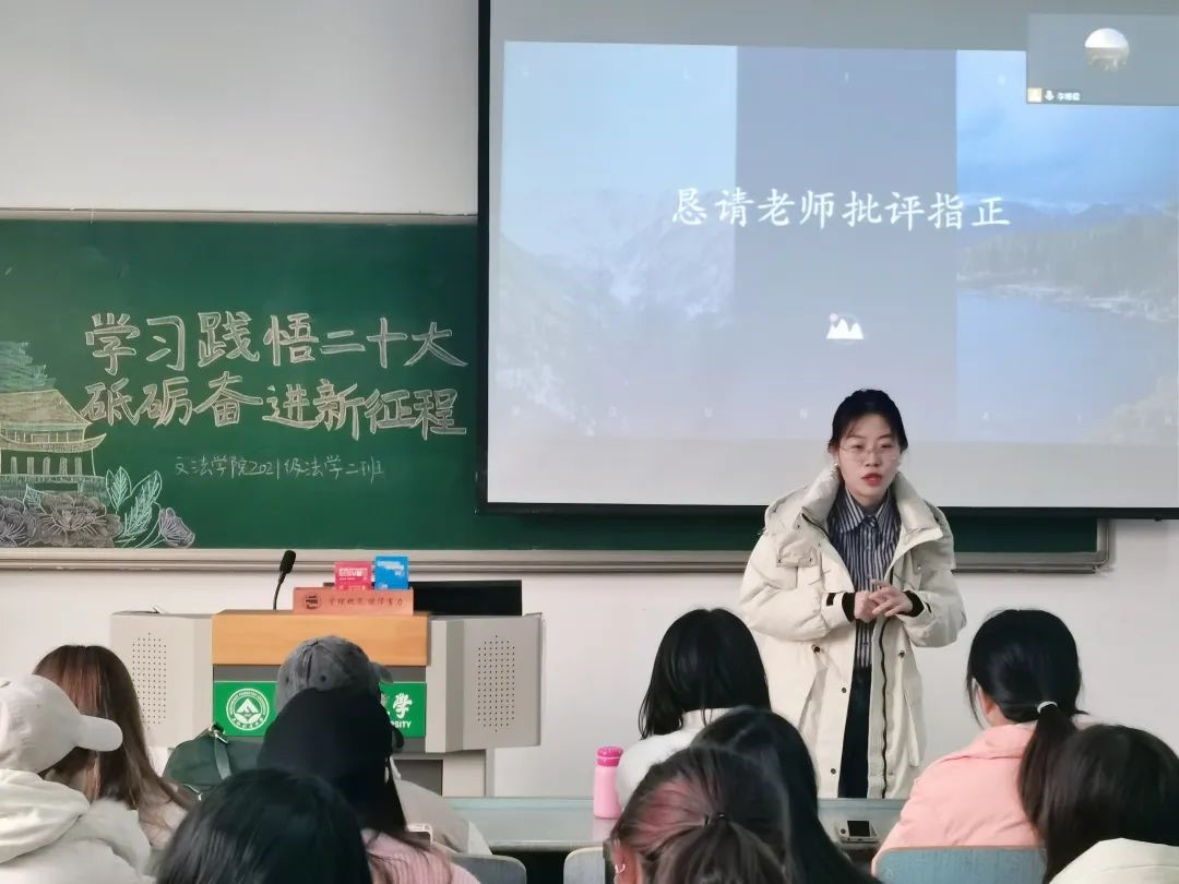 会议共分为四个部分。第一部分,宣传委员刘思成带领同学们重点学习了二十大的主题、中心任务等相关内容,她在讲解中聚焦中国式现代化、三件大事,三个务必、五个坚持等热点核心词汇,帮助同学们更好的学习和理解;第二部分是以视频学习的方式帮助同学们从新的角度理解二十大精神,学习二十大报告内容;第三部分是以知识问答互动的方式提高同学们学习的积极性。法学二班将通过系列学习活动增强同学们的责任感、使命感,引领广大青年学子奋进新时代。
