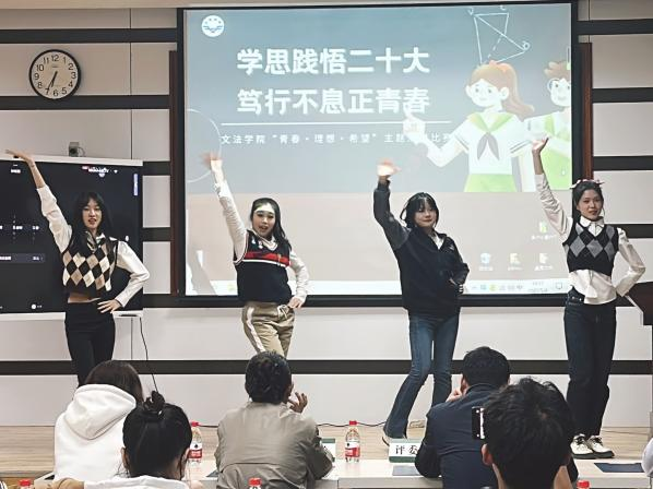 在比赛中场休息时,2021级周灿、胡艺馨、王隽然、周僖秋4名同学伴随着轻快的旋律,为大家带来舞蹈《喊出我的名字》,展现出文法学子蓬勃向上的青春朝气,2021级吴瑶瑶同学为大家深情演唱歌曲《不忘初心》,感染了全场师生,更是将现场气氛再次推向高潮。