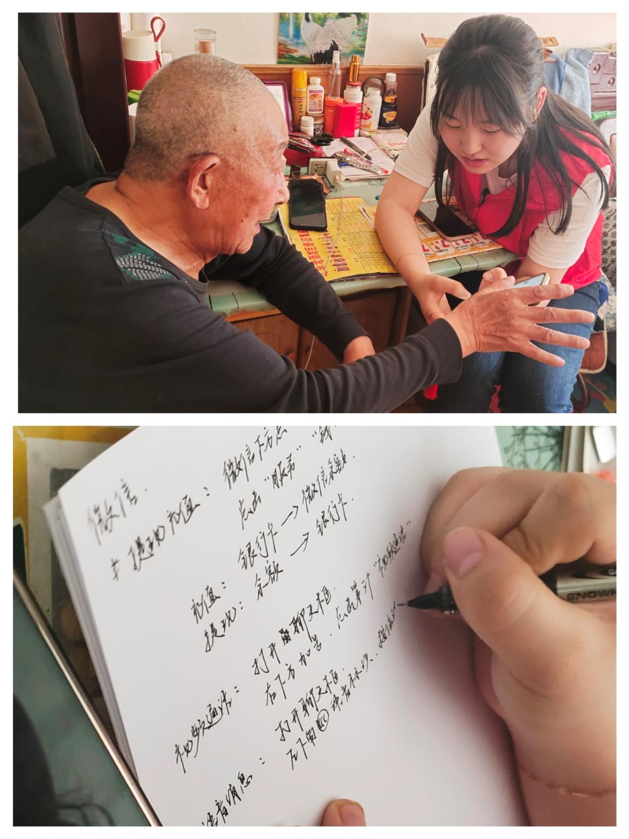 在交流过程中,志愿者们发现老人在在电子设备使用方面有较大困难,甚至有时不能及时和儿女联系。为了切实帮助老人解决这一问题,两名志愿者开始仔细地给老人讲解如何使用微信,另一名志愿者在经老人同意后在老人的手机上进行演示,其余两名志愿者则拿出纸笔将所有细节和步骤一一记下。五名志愿者团结合作、分工协作一起教老人使用微信发送语音消息、拨打微信语音和视频电话、收发微信红包、使用微信提现等实用功能。