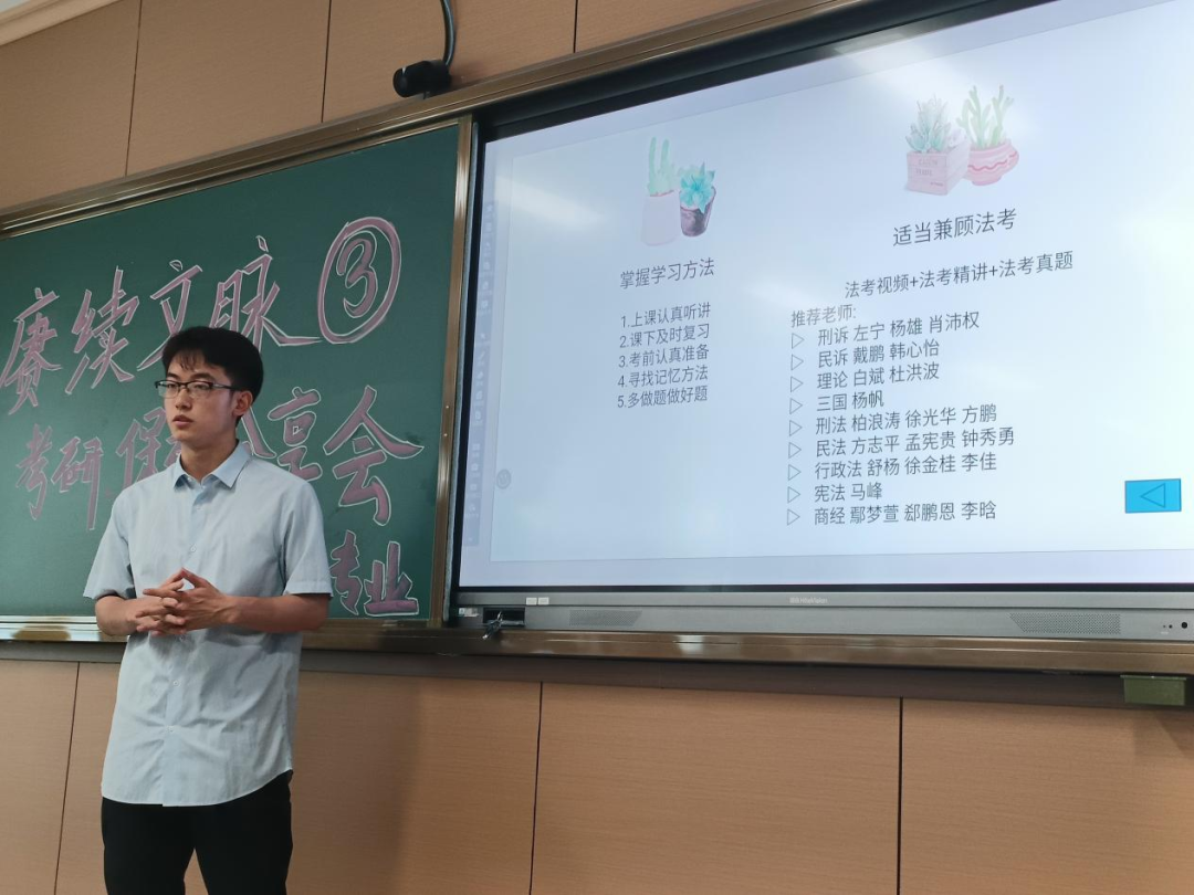 马亚浩同学主要从学习方法的角度来进行讲解。首先上课要认真听讲,每一节课都应该用心学习,课下也要及时的复习学过的知识,正所谓温故而知新,可以为师矣。考试前要认真的进行准备,不要不重视而粗略的准备,这样不能考出好的成绩,要寻找一种适合自己的记忆方法,法学的知识十分庞大,知识点也十分复杂,要背的也特别多,寻找一种适合自己的有效记忆方法十分重要,要努力建立起自己的记忆宫殿。法学会面临法考,在保研的过程中也要适当兼顾法考,要多做题、做好题,并给大家推荐了一些优秀的老师讲解。总之法学保研是一个需要长期坚持的过程,是一个需要长期努力的过程,是一个需要长期攻坚困难的过程,在这整个过程中,要脚踏实地,也要寻求方法,要尽力而行,也要灵活变通,要虚心求教,也要创新思维,这是一个需要记忆的过程,也是需要不断巩固的过程。
