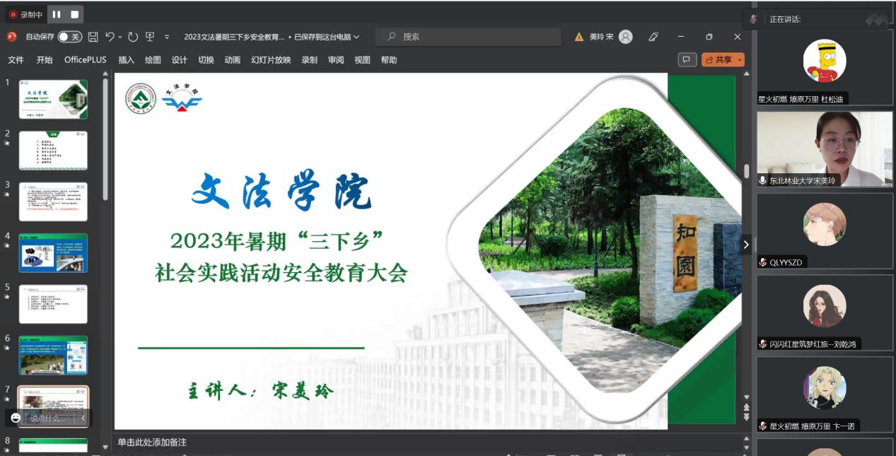 会上,宋美玲老师分别从交通安全、防溺水安全、食品卫生安全、预防自然灾害、注意人身财产安全等七个方面进行具体讲解,并结合社会实践中发生的各种实际案例,对同学们进行安全教育。她强调参与社会实践的团队要把安全放在首要位置,牢固树立安全第一、纪律为先的观念,做好安全报备与突发情况的应对处置方案。