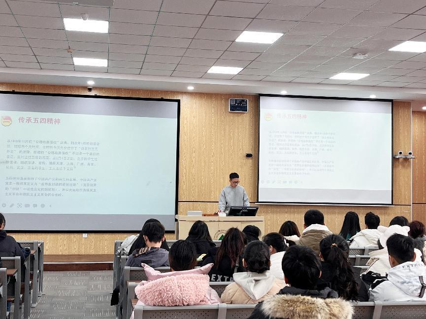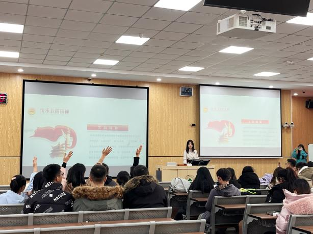 本次活动共分为三个部分。第一部分,刘一帆同学带领同学们回顾了习近平总书记在党的二十大中对广大青年的寄语,帮助同学们明确当代青年的使命与责任。第二部分是以视频学习的方式带领同学们回顾了百年前广大青年为民族独立和人民解放所做出的艰苦卓绝的奋斗历史。通过观看《建党伟业》等历史影片,同学们深刻感受到先辈们为国家作为、为民族担当的坚定信仰。第三部分是以知识问答互动的方式提高同学们学习的积极性。