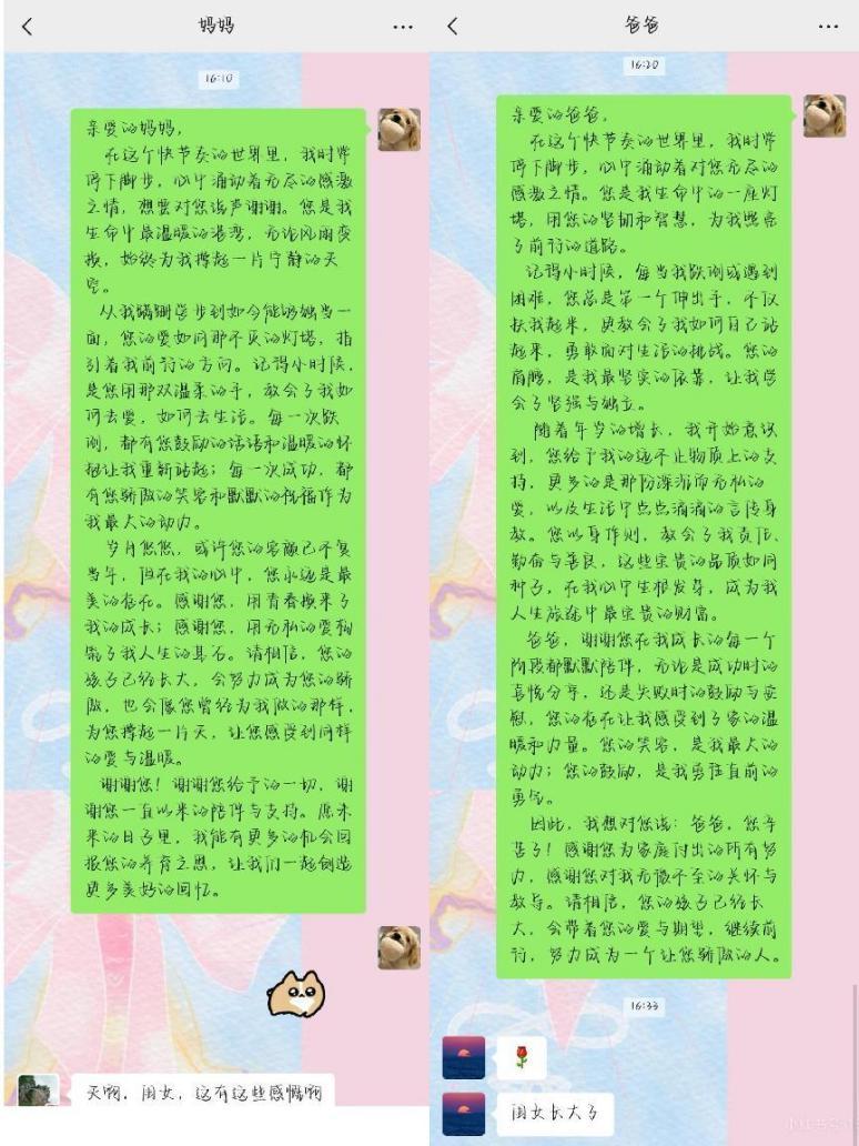 23级张楚妍感慨道:“我意识到,孝顺与爱不仅是我们作为社会成员的基本道德要求,更是实现自我价值和获得内心平静的重要途径。在与家人沟通的过程中,我感受到了一种久违的温暖,这种情感的交流让我明白,爱与关怀是生活中不可或缺的部分。”