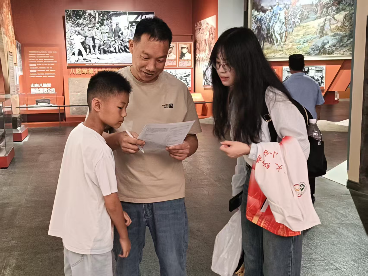 队员们在调研过程中还偶遇一位现役军人,交流间,他眼中闪烁的热忱与谈及沂蒙精神时的郑重神情,让队员们深切感受到那份刻在军人骨血里的革命历史情怀。同时,队员们也注意到,在参观过程中,他以亲身经历为脉络,向孩子介绍着展馆中一个个历史物件背后的烽火故事,让红色基因的传承在代际对话中自然流淌。