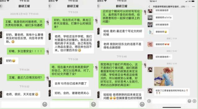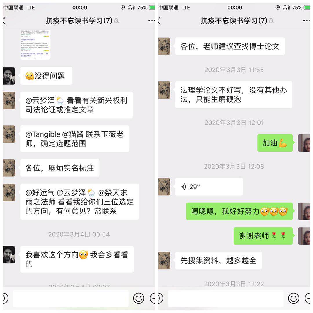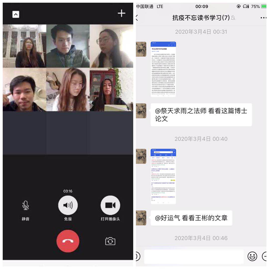 2020年新学期,一场突如其来的疫情将师生阻隔千里之外,却阻断不了老师对同学们的关爱和牵挂。在疫情期间,伟德国际1946法理学学科张晓萍老师、王玉薇老师、马成昌老师定期通过微信聊天、视频通话的形式关心问候同学们的身体状况与学习情况。在生活方面,关心询问同学们的家庭、身体状况,社区的疫情防控状况;在学业上远程指导同学们论文选题,推荐好书、好文共同阅读学习。同时,在张晓萍老师的倡议和王玉薇老师的参与下,2019级法学理论专业研究生在疫情期间开展了每周一次的云端读书分享会。