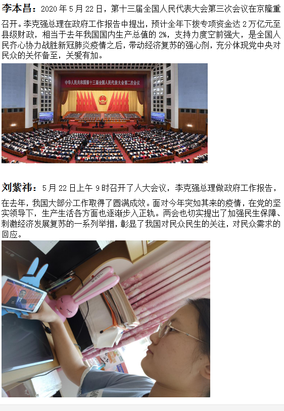 “风雨压不垮,苦难中开花”,我们坚信,在以习近平同志为核心的党中央的坚强领导下,全国人民的众志成城必将夺取抗击疫情的伟大胜利和经济发展的全面复苏。文法师生将把学习“两会”精神转化为进一步做好常态化疫情防控工作的动力,以崭新的精神风貌,全面落实公司有序返校复课的工作部署,为公司教育事业全面发展贡献文法人应有的力量。