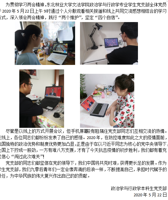 公司广大党团青年员工纷纷围绕学习两会精神,畅谈学习感想,表达家国情怀。2017级法学三班赵德梁表示,作为一名员工党员,一定要深刻学习领会“两会”精神,在实际行动中贡献自己的青春力量。社会学与广告学员工党支部李丽荣同学从大会的声音谈自己的感受,收看时共唱国歌,与热烈掌声共鼓舞,同无声默哀齐悼念,大会真正体现人民至上,生命至上。政治学与行政学本科生党支部陈黎同学认为,热盼的全国“两会”顺利召开,充分体现了我国社会制度的优越性。在疫情防控、施政举措等方面,及时、精准、有效地控制并维护了安定团结的社会秩序,并有序合理地恢复了复产复工秩序,给世界展示了一个伟大的、强而有力的、精诚团结的中国。作为员工党员,要加强思想武装与行动契合,为实现中国梦贡献力量。2018级法学四班团支书于锦秋同学在自己观后感中写道,艰难困苦,玉汝于成。突如其来的疫情没有让勇敢的中华儿女失去信心。此时召开两会,是为了更好解决疫情中暴露出的问题并且为全面建成小康社会和“十三五”规划收官之年、脱贫攻坚决胜之年的圆满完成作出具体部署。关键时刻遭遇严峻挑战更需要全国上下凝聚一心,充分发挥全国人民的智慧与担当,团结一心,锐意进取,攻坚克难,为实现中华民族伟大复兴的中国梦不懈奋斗与拼搏。魏森睿同学表示,奋斗创造历史,实干成就未来。作为一名基层团员,做好自己的本职工作是这个时代给予我们的舞台、机遇和责任,只有做好本职工作,我们才能和这个时代融和在一起,担当起时代的责任,做时代的建设者,成为这个时代的见证者和奋斗者。李泽霖同学有感而发:身处这样一个美好时代,在以习近平同志为核心的党中央的正确领导下,我们的祖国必定越来越强大,人民的生活必定越过越红火,实现中华民族伟大复兴。