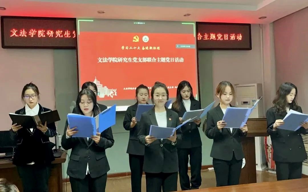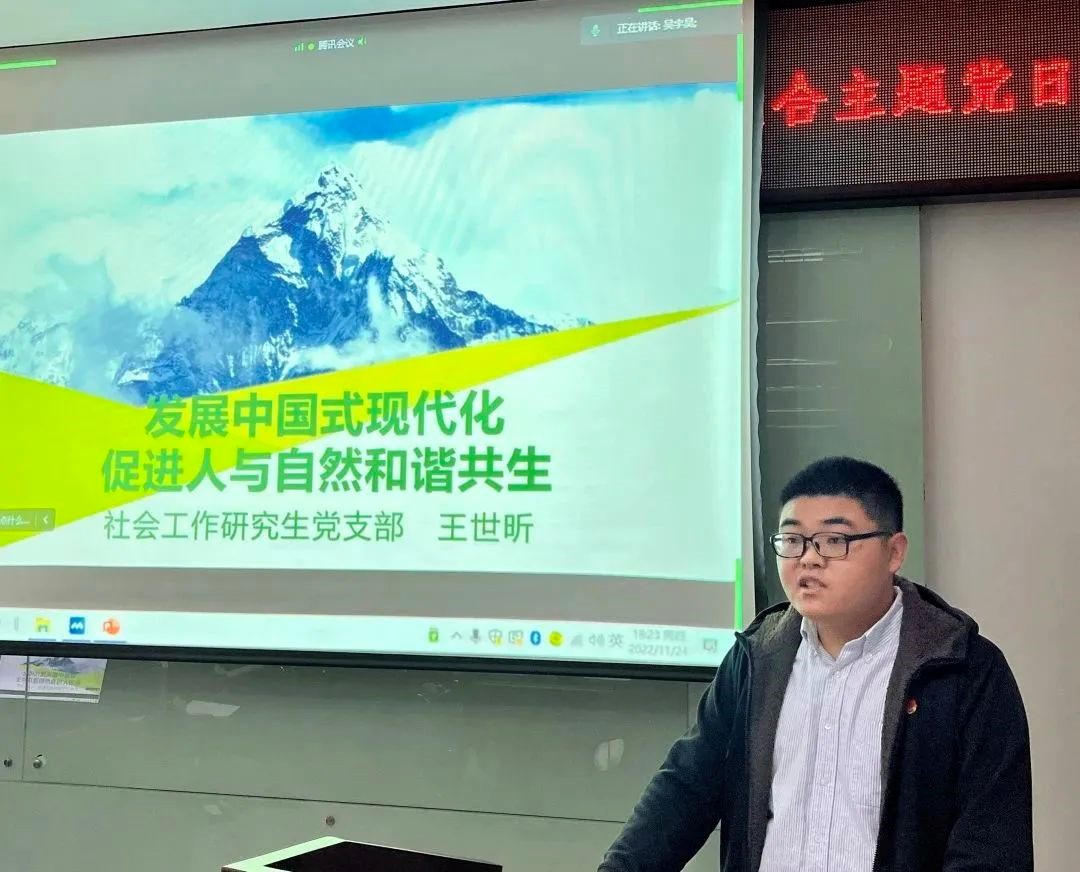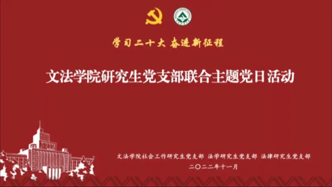活动中,来自法学研究生党支部的于晨彤同志作了题为《坚持依法治国 推进法治建设》的领学分享,她立足法学理论专业学习实际,结合党的二十大报告,从完善以宪法为核心的中国特色社会主义法律体系、扎实推进依法行政和严格公正司法三个方面做了分享;来自法律研究生党支部的孙心雨同志作了题为《永远跟党走 奋进新征程》的领学分享,她结合自己工作学习生活的实际,通过学习党的十八大十年以来发生的三件大事和习近平总书记对青年的寄语谈了自己的感受;来自社会工作研究生党支部王世昕同志作了题为《发展中国式现代化 促进人与自然的和谐共生》的领学分享,他就中国式现代化与同志们分享了几点自己的看法,并从二十大报告原文中的生态文明思想内容、生态文明理念的历史渊源、我国在生态文明建设做出努力以及作为东林学子如何践行生态文明思想讲了自己的看法。来自各个研究生党支部的八位同志朗诵《青春献礼二十大 诗颂祖国诗颂党》,表达了新时代青年党员不负韶华、不负人民的决心,让青春在全面建设社会主义现代化强绽放出绚丽之花。