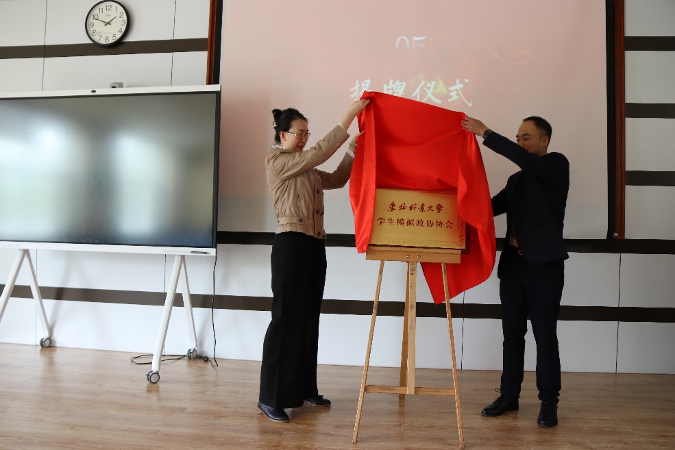 政协哈尔滨市委员会办公厅秘书处副处长杨磊与协会指导教师程铭为协会揭牌