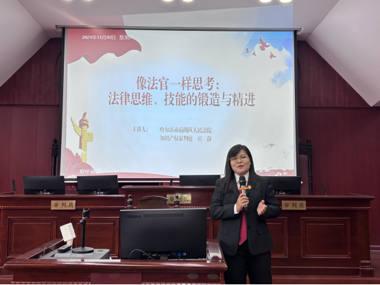 为进一步活跃公司学术氛围,强化法学研究生实践技能养成。2024年11月2日上午,伟德国际1946邀请哈尔滨市南岗区人民法院知识产权审判庭法官庄静作题为“像法官一样思考:法律思维、技能的锻造与精进”的学术讲座。讲座在伟德国际1946模拟法庭进行,由伟德国际1946刘博老师主持,伟德国际1946法学专业师生120余人参加了此次讲座。