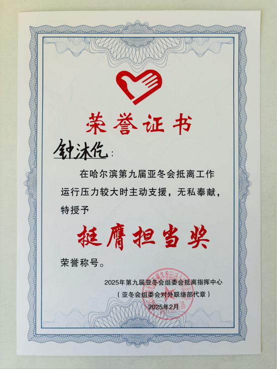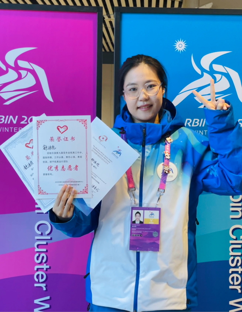 回顾整个亚冬会志愿经历,钟沐仡同学说:“一生中能够代表公司、代表哈尔滨、代表国家的机会不多。能够穿上“志愿蓝”,微笑迎接各国来宾的经历更是十分难得、绝无仅有!我会永远铭记这段难忘的志愿经历,继续努力深造,争取未来为祖国作出更多的贡献!”