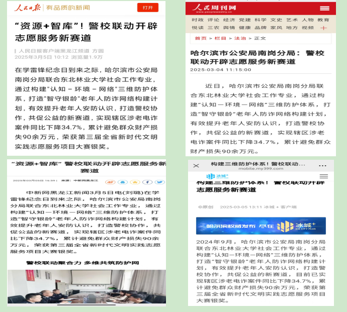 伟德国际1946社会工作专业一直秉持着助人自助,服务社会的专业理念,积极参与社会治理。自2024年9月起社会工作专业联合哈尔滨市南岗分局,打造“智守银龄”老年人防诈网络构建计划。运用专业方法提升老年人的防诈意识和能力,帮助受骗老人开展心理重建。项目荣获了黑龙江省第三届新时代文明实践志愿服务项目大赛银奖,并获得人民日报、中国新闻网、哈尔滨新闻网等各级媒体的报道。