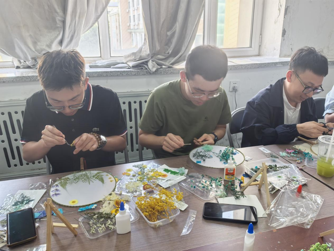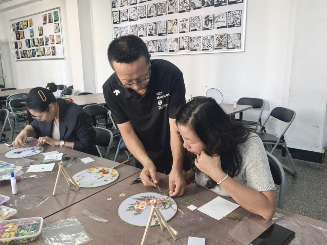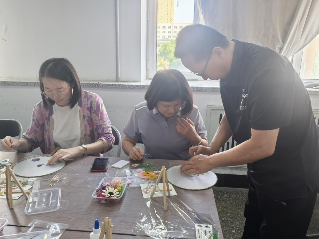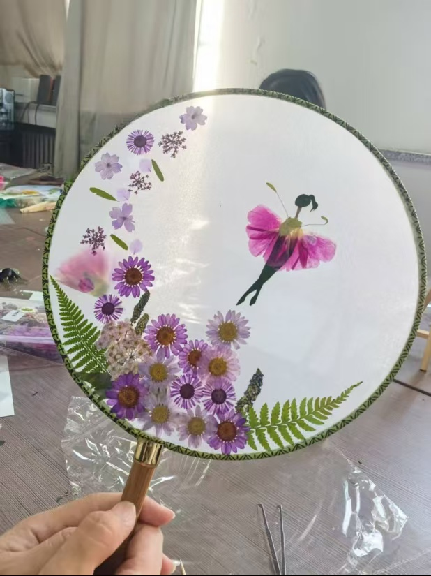 活动邀请了家居公司的高飞老师为老师们讲解压花工艺的相关知识,高老师首先就如何发现美、如何创造美,给老师们上了一堂精彩的艺术修养课,随后手把手教老师们花瓣摆放、构图技巧,制作过程中老师们进一步的领悟到如何用色彩呼应传递心意,怎样借花材形态表达祝福,手中的团扇不再只是摆件,成了能传递情感的艺术品,更显珍贵。