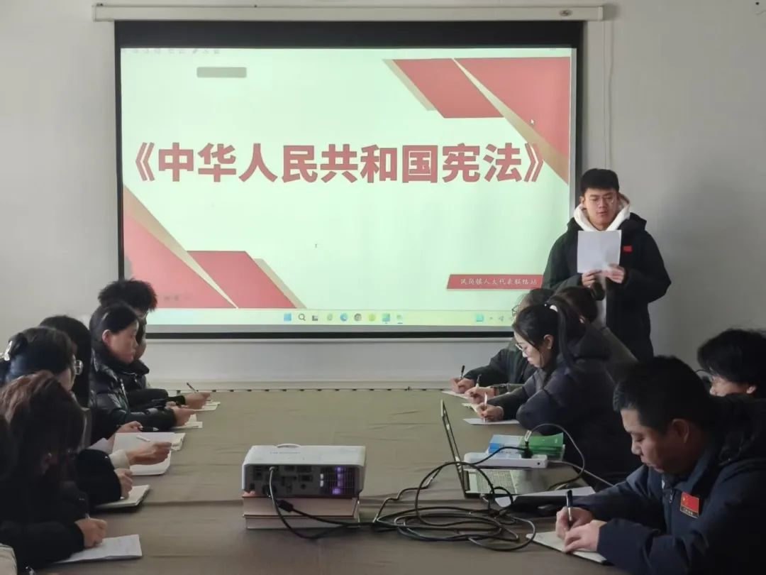 为推动法律宣传和安全教育的深入开展,赵博扬受邀为凤岗镇20余名县、镇两级人大代表进行宪法专题宣讲。他充分发挥专业优势,系统梳理宪法发展历程,重点解读人民代表大会制度、人大代表职权等章节,并结合基层治理实际案例展开讨论,帮助代表们深化对宪法权威的认识,增强了人大代表们依法履职的责任感和使命感。