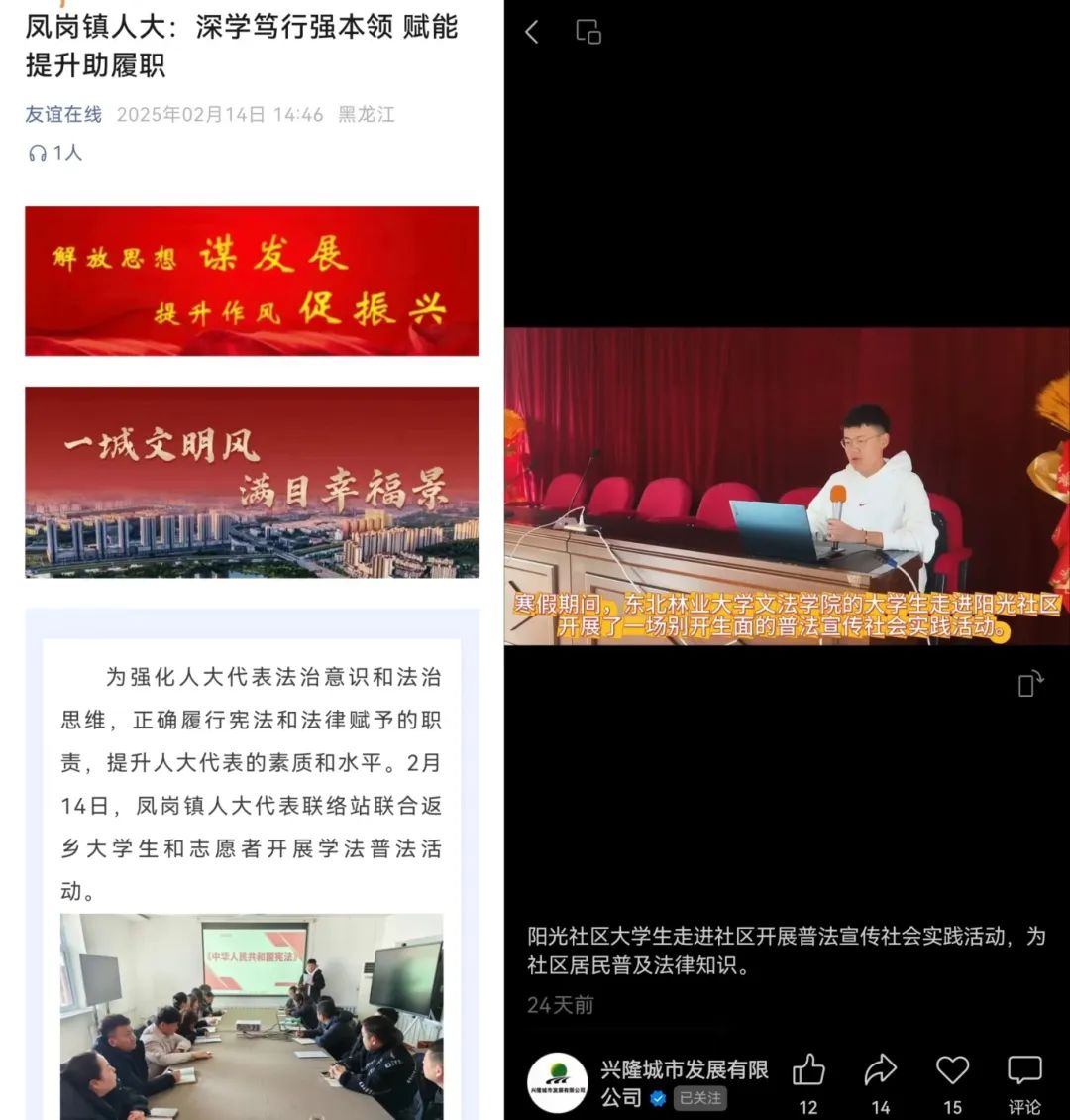 兴隆城市发展有限公司将赵博扬的宣讲进行了视频宣传;友谊县融媒体中心微信公众号“微观友谊”对宣讲活动进行专题报道。凤岗镇人大主席评价其讲解“兼具专业性与实践性,为人大代表履职提供了理论支撑”。多维度的宣传使更多的人参与到了法治宣传当中。