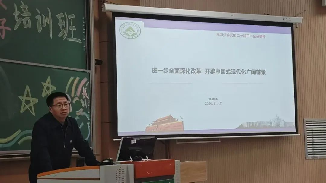2024年11月17日上午,公司党委举行了2024年下半年发展对象及入党积极分子培训班暨开班第一课,公司党委副书记郭婷婷代表公司做动员讲话。在开班第一课中侯彦杰书记为大家讲授《进一步全面深化改革 开辟中国式现代化的广阔前景》专题党课。从党的二十届三中全会的重大成果、主题、总目标、重大举措、进一步全面深化改革的聚焦点、重要原则、根本保证等方面进行详细讲解。