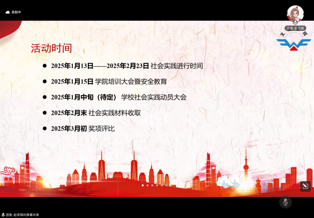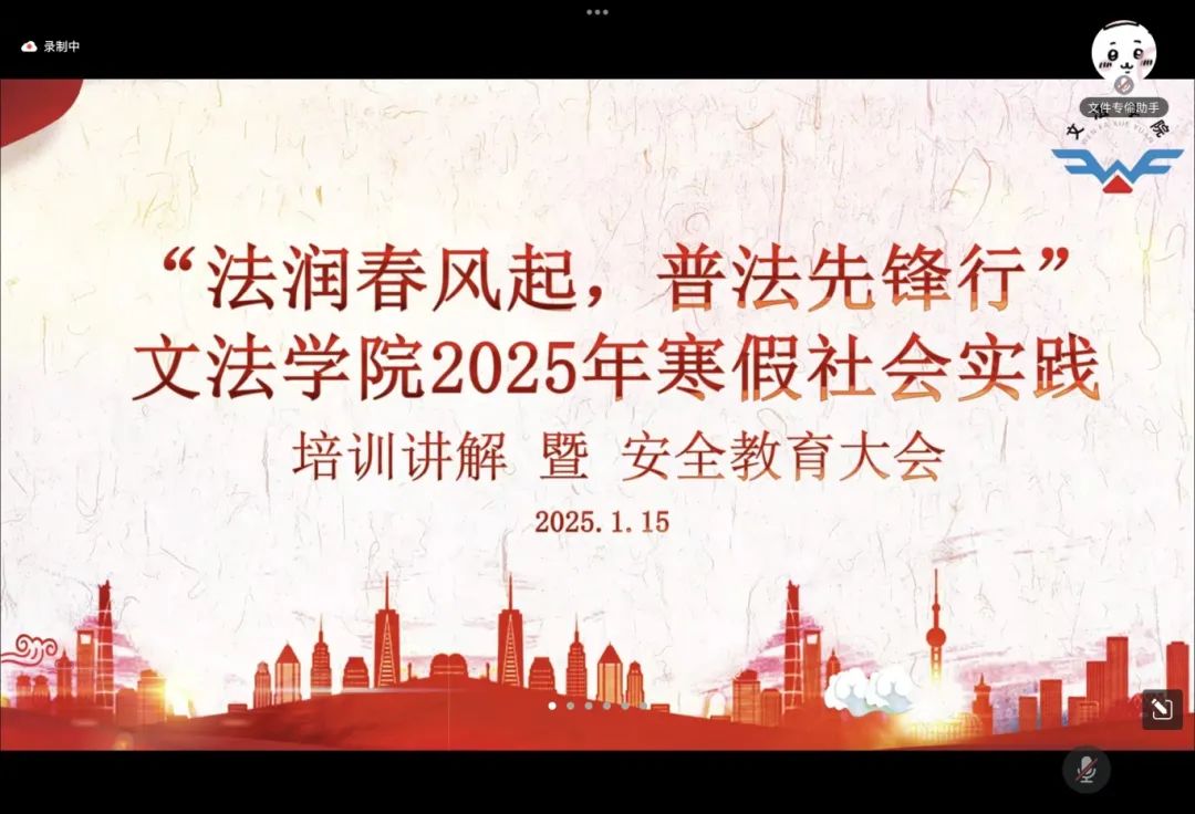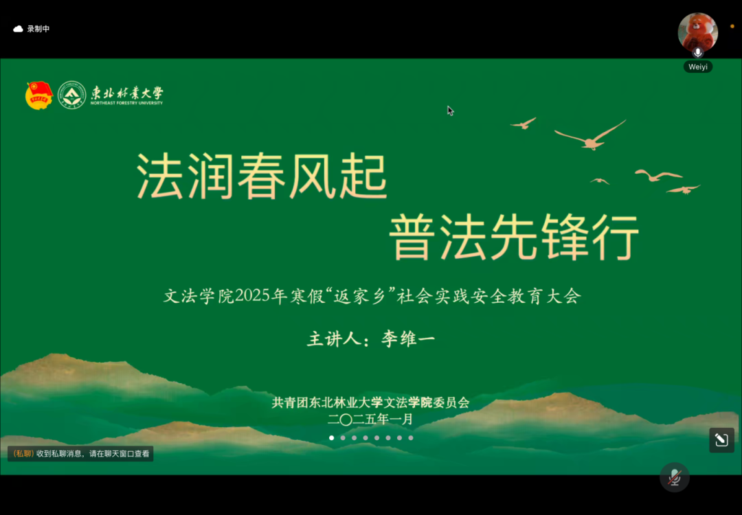 为深入学习贯彻习近平法治思想,贯彻落实党的二十届三中全会精神,让法治观念深入人心、蔚然成风,更好地培育东林学子的法治意识,伟德国际1946团委于1月15日下午16:00线上召开伟德国际19462025年寒假“返家乡”社会实践动员大会暨安全教育大会。伟德国际19462024级本科生辅导员李维一老师、公司团委副书记赵奕辉,以及来自3个公司的123名社会实践成员参加本次线上会议。会议由公司团委科创实践部部长杨博雯主持。